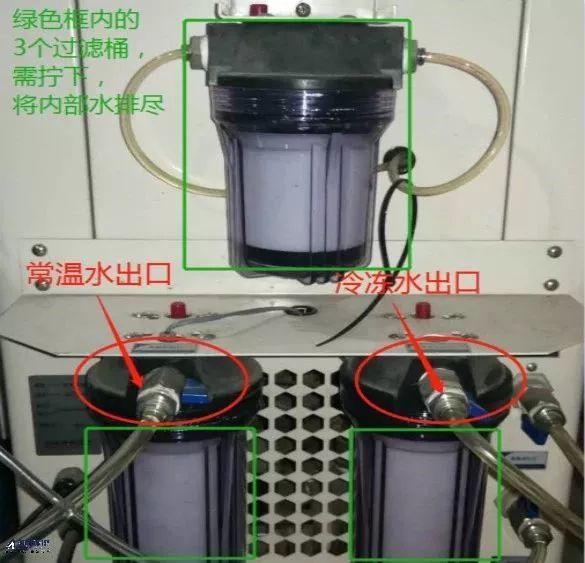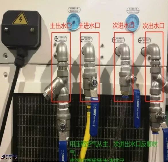 (2)管路中的排水:如图3、图4,用0.2MPA左右的压缩空气从冷冻水、常温水的进出口分别吹1分钟,由水箱的排水口排水。